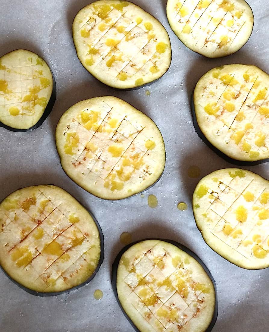 3. place eggplant slices on a baking tray lined with parchment paper; score each slice vertically and diagonally, drizzle or spray a little EVO oil and sprinkle salt and pepper all over.