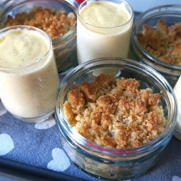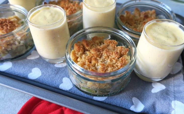 For the crumble, I use a mixture of ground almonds and desiccated coconut, with sweetener and butter. It’s ultra simple to make and crisps up really well.