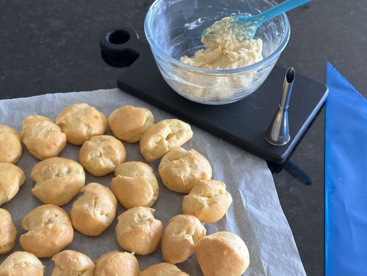 - fill the sac à poche, snip the end and pipe 22 small mounds (3cm wide) - the batter will ooze out of the sac à poche opening, so move quickly from one to the next, leaving space in between to allow for a bit of spread.