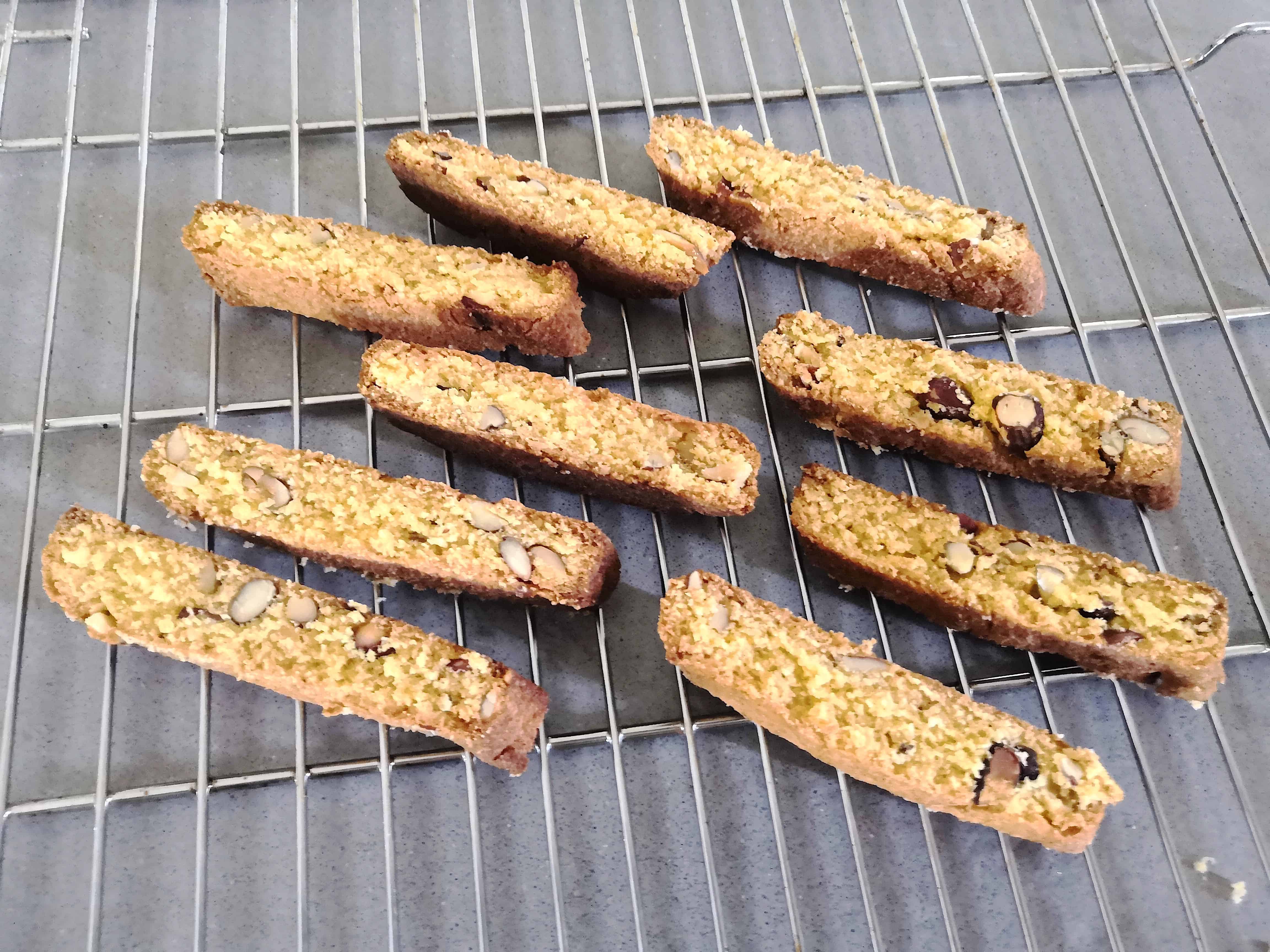 - turn off oven, pull tray out half-way and leave biscotti to cool.