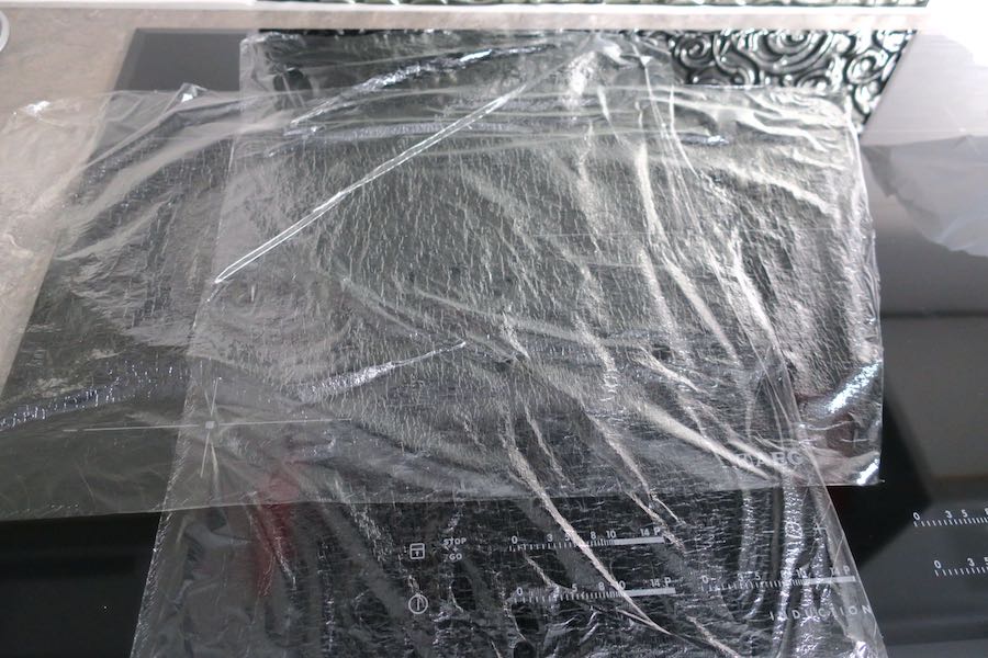 - place 2 large pieces of cling film in a cross shape over your counter and pour half the cure in the centre, spreading it to roughly the same size as your salmon piece.
