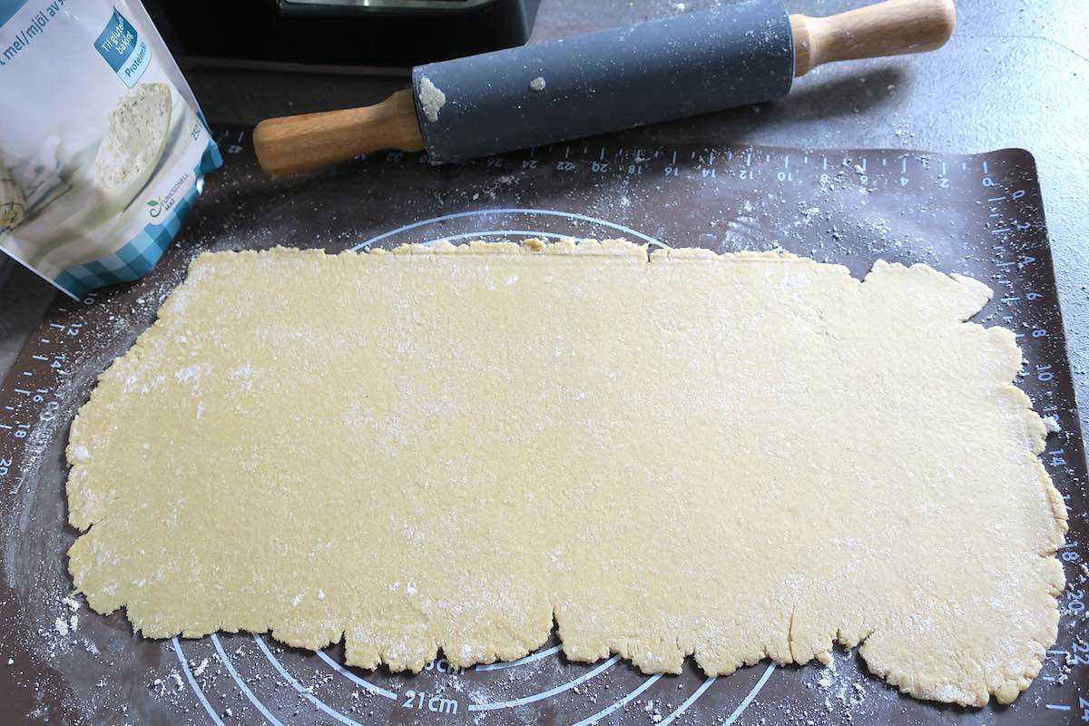 - dust a silicone pastry mat and rolling pin with a little sesame flour, place chilled pastry dough over the mat and stretch it out to a sheet about 40cm x 30cm.