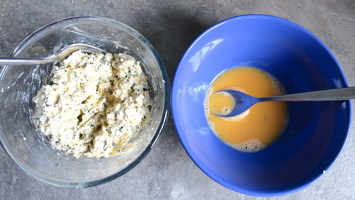 - beat one egg until foamy and add it to the Feta bowl; mix well, mashing it all up with a fork.