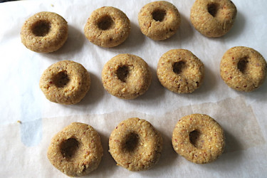 If you want to be precise, weigh it, and divide by 10 so you know how much you need for each biscuit. Place non-stick baking paper over a chopping board. Take 1/10th of dough and roll it between your palms. Place it on the chopping board, flatten it to about 1.5-2cm and make a central depression with your thumb or the back of 1/2 tsp measure. Repeat for the other 9 biscuits.