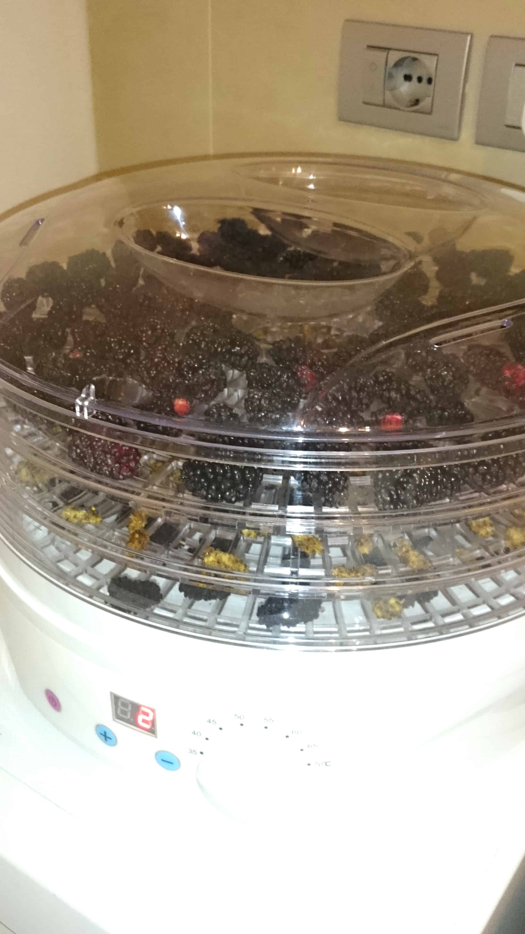 Option 3. The dehydrator. Cheap, efficient, less power-hungry than a traditional oven. Perfect results. I bought mine recently and I’m hooked (HERE‘s a good U.S. option). You can dehydrate pretty much anything: fruit, vegetables, meat. You can make your own snacks or even dog treats. Amazing! Another kitchen gadget I’m in love with! Make sure berries do not overlap or they will tend to stick together.